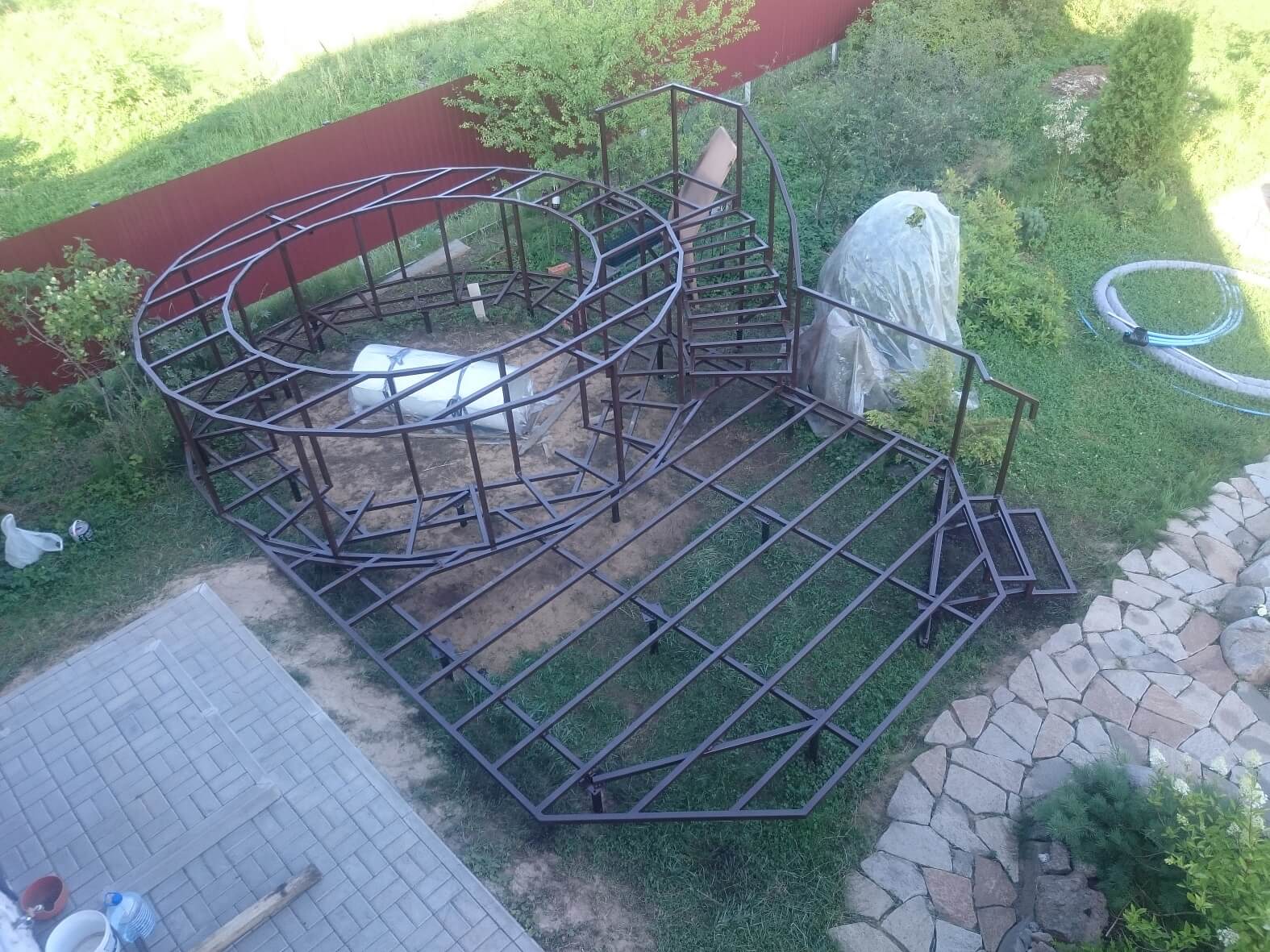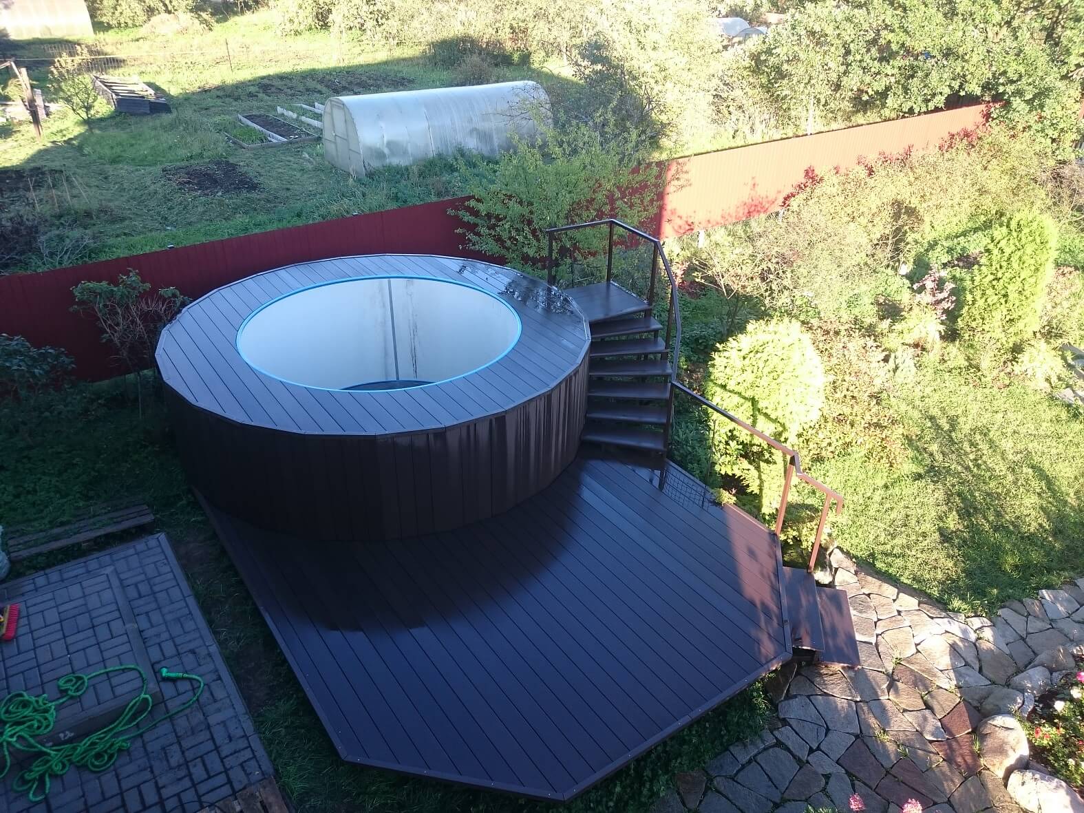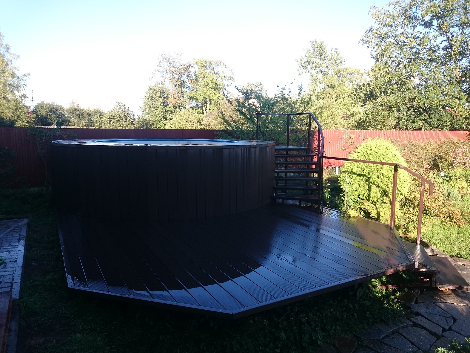 Ленинградская область, город Отрадное. Купель из металлического каркаса, террасная доска FUNK венге и ступени ДПК